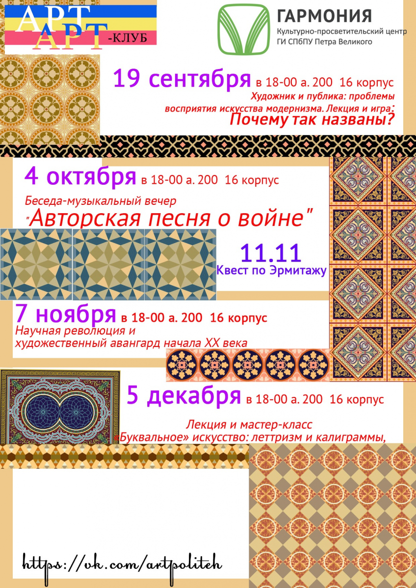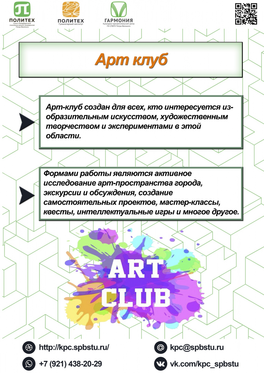 Арт-клуб Политеха — это пространство, которое дает возможность познать язык художественного творчества, как с теоретической, так и с практической точки зрения. Здесь можно не только расширить представления в области различных видов искусства, новых и традиционных форм выразительности и репрезентации, но и самому почувствовать себя автором и творцом. Арт-клуб стремится изучать, и ищет способы, помогающие человеку выразить себя в необычных формах, задуматься о том, что никогда не приходило в голову, попробовать познать мир через искусство.
