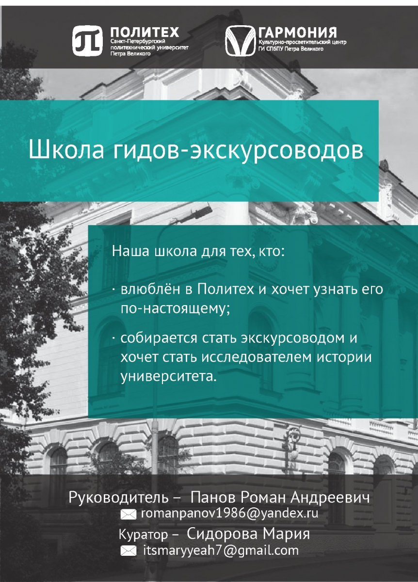Школа экскурсоводов — это маленький мир с большим сердцем, заботящийся о целостности и правильности информации, передаваемой из поколения в поколение, изучающий историю, важнейшие события из жизни Санкт-Петербургского политехнического университета Петра Великого: от закладки первого кирпича до современных побед и достижений. Школа экскурсоводов — это то место и люди, старающиеся сохранить свидетелей прошлого: все документы и предметы — всё, что было «до» ради того, чтобы «после» можно было вспомнить и поделиться чем-то настоящим и правдивым. В данной школе научат любить историю и проводить экскурсии, даря знания и вкладывая частичку себя в каждого слушателя и в каждый маршрут, изученный, проложенный и пройденный.